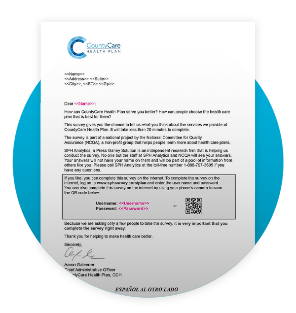 La encuesta de Evaluación del Consumidor de Proveedores y Sistemas de Atención Médica (CAHPS) es su oportunidad para decirnos lo que piensa acerca de los servicios que brindamos en CountyCare. La encuesta es parte de un proyecto nacional a cargo del Comité Nacional de Garantía de Calidad (NCQA), un grupo sin fines de lucro que ayuda a las personas a conocer más acerca de los planes de salud.